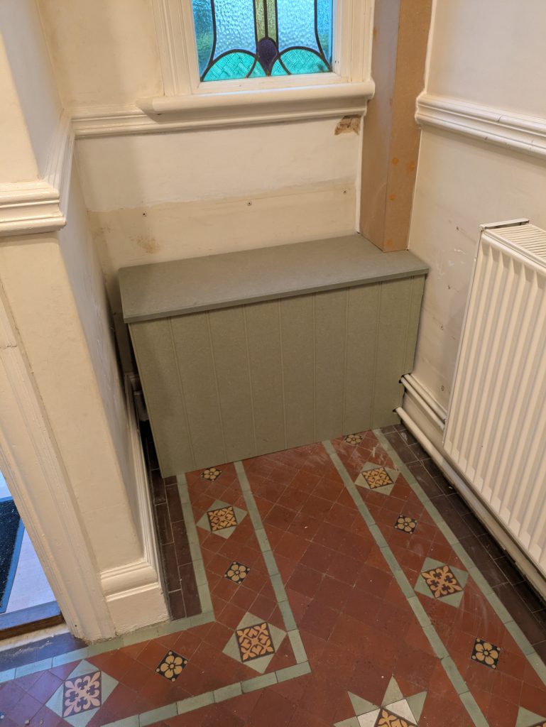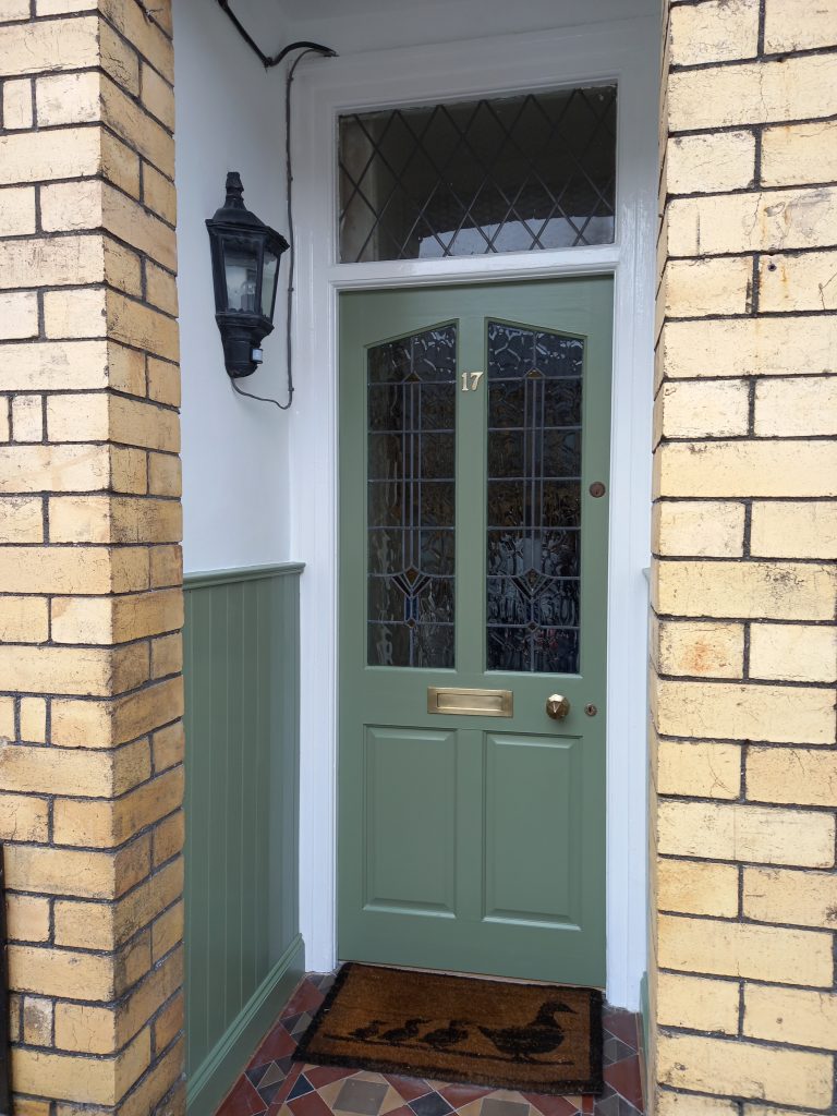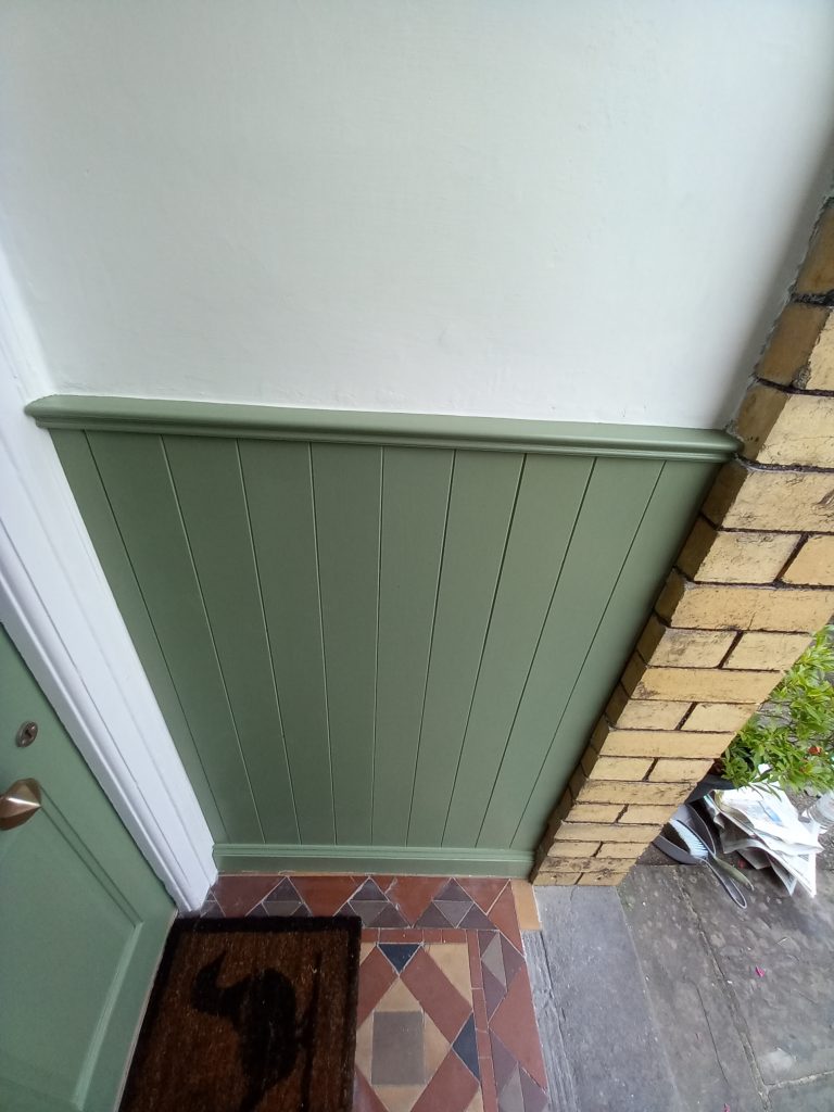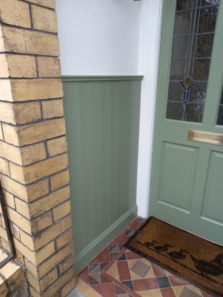 Poarch revival! I made tongue & groove panelling to cover dated 1970s wall tiles, painted the door, repaired plaster to the walls, replaced broken floor tiles and re-grouted them and cleaned up the brass fittings.