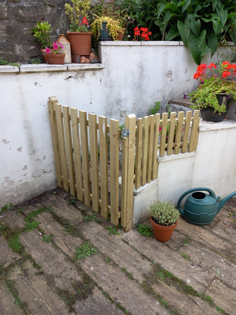 The barrier to the garden steps was not functional in stopping this customer’s dog getting into planted areas of the garden, the new gate and fence I installed on top of existing brickwork provided a good solution.