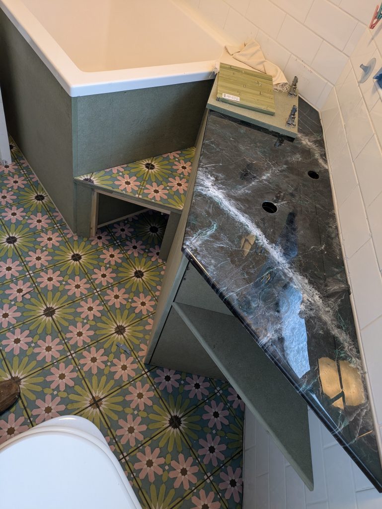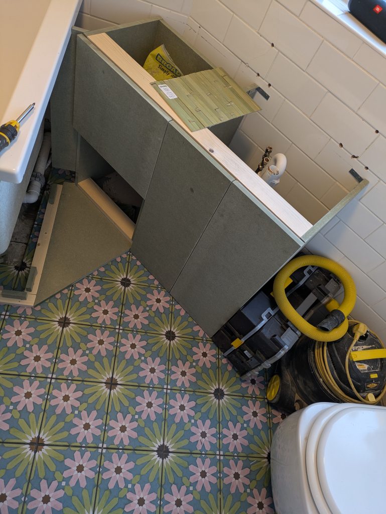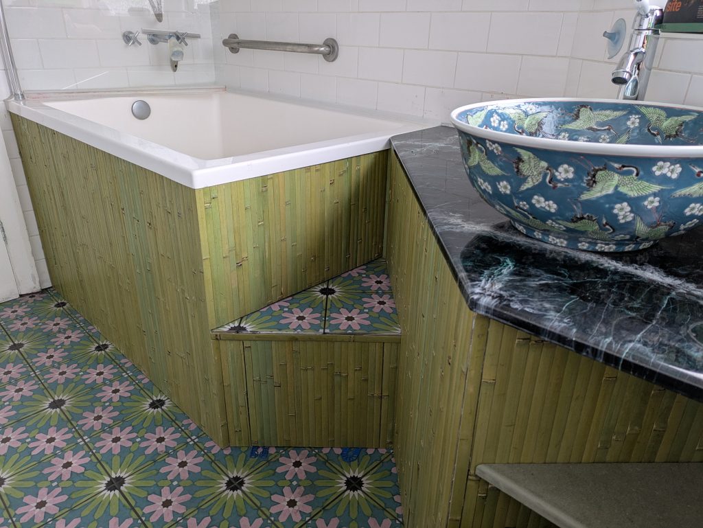 Floor tiles laid, bathroom cabinet and bath surround built to the clients design and then clad in Bamboo.