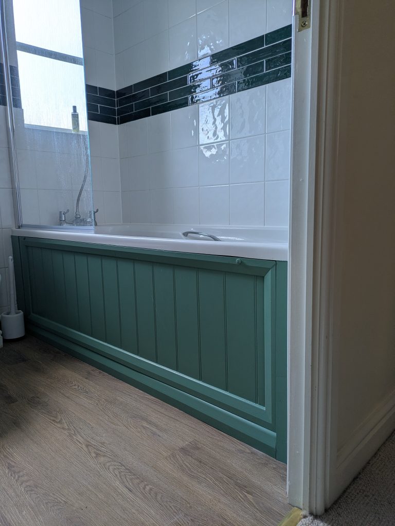Bathroom shower screen installed, bath panel made to complement the style of the bathroom
